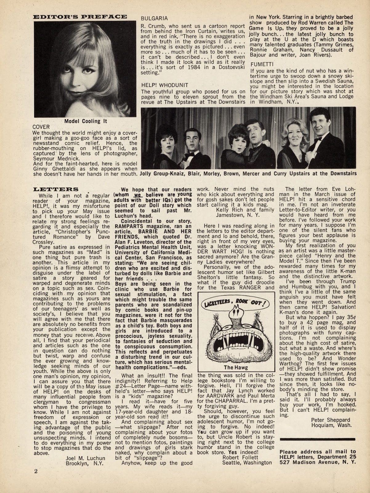 After leaving Mad, Kurtzman created a short lived satire magazine for Hugh Hefner's publishing company before Hef pulled the plug after 2 issues. He then created Humbug with his friends and fellow artists that was creatively brilliant but sold poorly due to distribution issues. That title folded after 11 issues. Then, in 1960 he created HELP! for James Warren's company. HELP! lasted 5 years and was produced on a tight budget. The pages were mostly filled with fumetti comics (photo comics) but throughout its 5-year run, it had it's inspired moments. The creative people that worked on the magazine or had early work published is astonishing. Robert Crumb, Terry Gilliam, Gloria Steinem, Will Elder, Jack Davis, Skip Williamson, Woody Allen, Jay Lynch, Gilbert Shelton, John Cleese, to just name a few, were involved in some capacity over the course of its run.