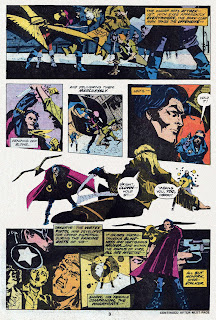 Chaykin wrote and illustrated Monark Starstalker which appeared in the October 1976 issue of Marvel Premiere. This is an absolutely stunning comic. Chaykin seems to be in full command of his design sense as well as his linework. His early DC work from just a few years earlier (1973-74) was already filled with great character designs and page layouts but he still seemed to be chasing a style. By the time he created this strip, he seems to be fully formed (at least he seemed to be until he took it to the next level with Flagg). This comic is filled with bold sharp graphics that show a strong Alex Toth influence. The writing is perfectly fine, it's a typical Chaykin character that combines a swashbuckling hero in a space opera setting (that last part isn't as strong here) that began with his character Iron Wolf for DC in 1973 and continued throughout his career, but it's the graphics that really shine.